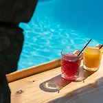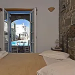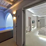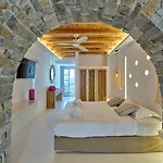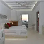 Surplombant le patio, certaines chambres de Zefi Hotel & Suites de style cycladique disposent d'une cheminée en pierre avec un bureau. Les clients peuvent utiliser une climatisation, ainsi qu'une cafetière/théière. Dotées d'une baignoire spa, certaines salles de bains sont équipées des peignoirs de bain et d'un bonnet de douche.